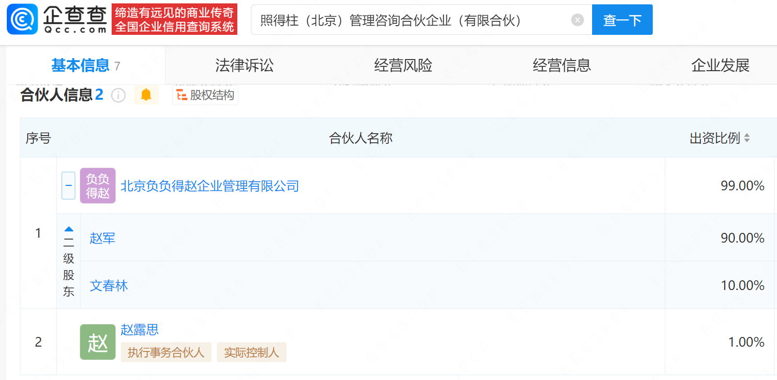 近日,照得柱(北京)管理咨询合伙企业(有限合伙)成立,执行事务合伙人赵露思,出资额10万元千层金配资,经营范围包含企业管理、专业设计服务、组织文化艺术交流活动等,由北京负负得赵企业管理有限公司和赵露思分别持股99%、1%,前者由赵军持股90%。值得注意的是千层金配资,赵军名下还关联成都负负得赵企业管理有限公司、成都马宁有限企业管理有限公司,后者由赵露思持股90%、赵军担任法定代表人,董事。