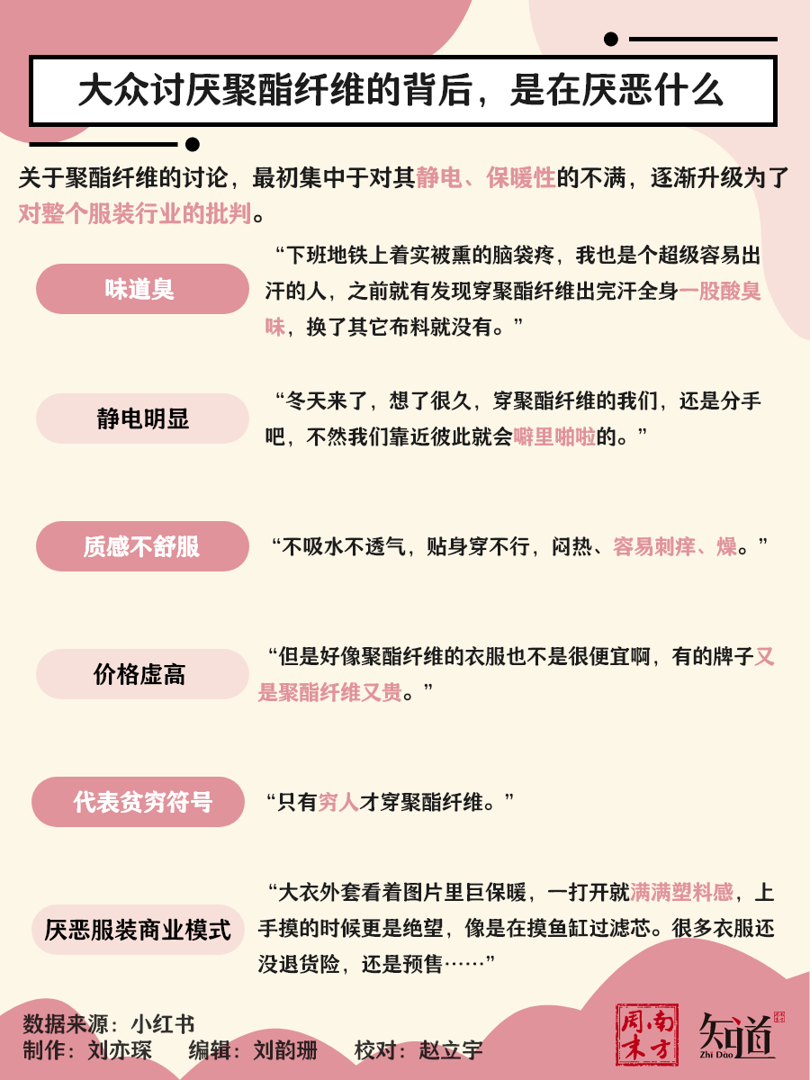 首先是颇受诟病的静电问题,无数个让人“一路火花带闪电”的冬天,都少不了聚酯纤维的“功劳”;其次是味道的问题,有网友吐槽穿聚酯纤维的衣服出完汗后会有一股酸臭味;最后是质感不舒服,不吸水不透气,容易闷热。
