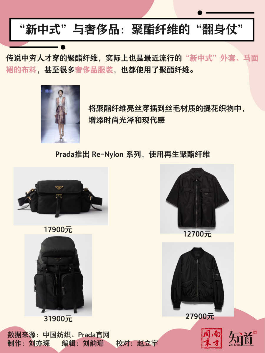 传说中穷人才穿的聚酯纤维,实际上也是最近流行的“新中式”外套、马面裙的布料,甚至很多奢侈品服装,也都使用了聚酯纤维,比如Prada推出的 Re-Nylon 系列就是使用了再生聚酯纤维,仅一个背包就被卖到了三万多元。
