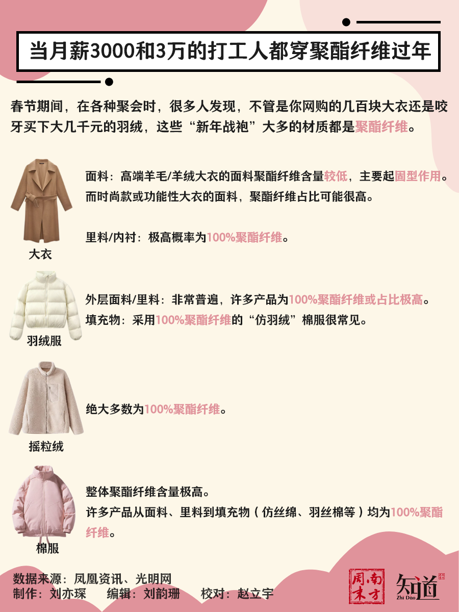 于是,无论你过年回家穿什么,区别似乎只剩下了聚酯纤维含量的高低。正如网友调侃的那样:“穿聚酯纤维衣服,等于穿了一身塑料瓶。”